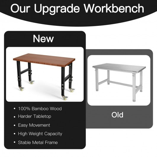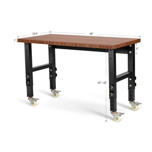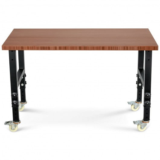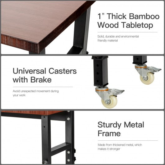 48"×24" Adjustable Height Workbench Mobile Tool Bench Bamboo Top with Caster-Coffee