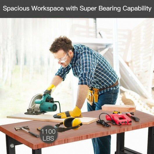 This is our heavy-duty bamboo workbench with 4 adjustable height legs! The tabletop is made of natural bamboo enjoying with great hardness and high density. And the legs are made of thickened metal to ensure their stability. In addition our workbench offers you plenty of space to put tools jigs and equipment. Its strong bearing capability ensures that it will not crack easily. The universal casters make it easy for you to move this tool table. And adjustable legs can accommodate uneven ground and meet your work projects. This workbench is suitable for garages industrial workshops automotive repair shops commercial shops office buildings and families. If you are looking for this product don't hesitate to buy it! Made of high-quality material including natural bamboo and thickened metal Large workbench top ample for you to put tools Treated with high technologies to ensure its stability and long run time Universal casters make it easy for people to move it 11-level adjustable heights from 30" to 40" to meet your work demand Caster lock ensures no sliding occurs during workbench usage Outstanding bearing capacity up to 1100 lbs