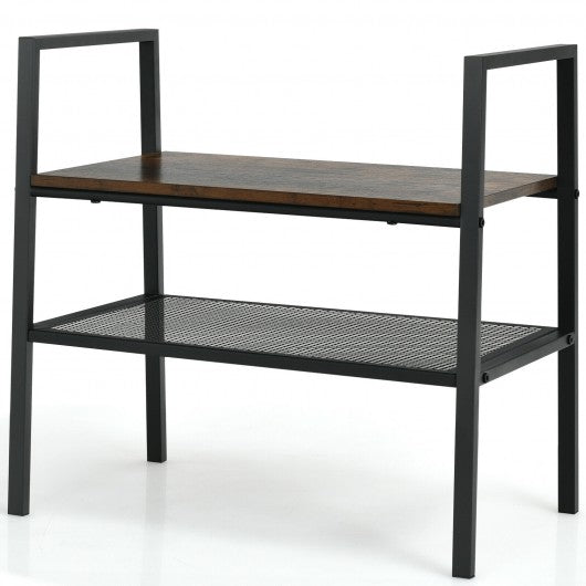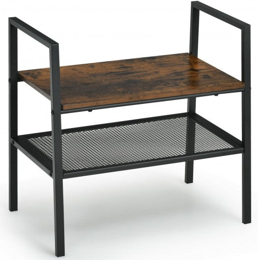 Made of premium engineered wood and heavy-duty powder-coated steel the side table is sturdy and stable which can be used for the long term.   The end table combines beauty and practicability in one. A classic industrial design can integrate into any decoration style perfectly. Ample storage space including desktop and lower shelf provides enough space for you to place sundries books ornaments shoes or kitchen supplies. It not only can be an end table in the living room or bedroom but also can be a kitchen shelf a shoe rack and a side table.   If you're looking for a storage table of compact size our side table maybe is a great choice for you!   Crafted with sturdy wooden board and premium steel frame A classic industrial design can integrate into any decoration style Compact size for narrow space of the living room office or hallway Design of 2-layer Stacking Structure to save more horizontal space Ample storage space allows the placement of a variety of supplies Easy to assemble with detailed instruction and clean with a cloth