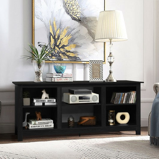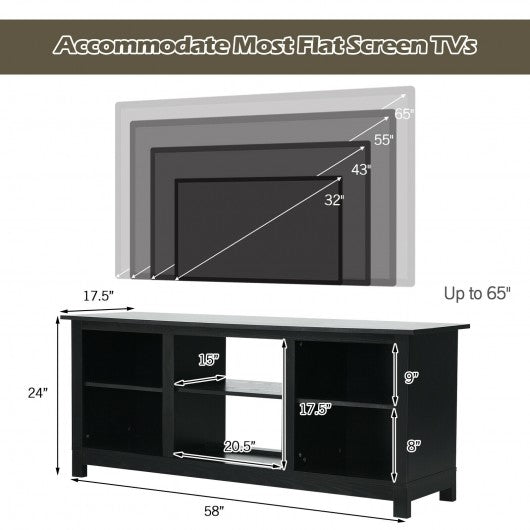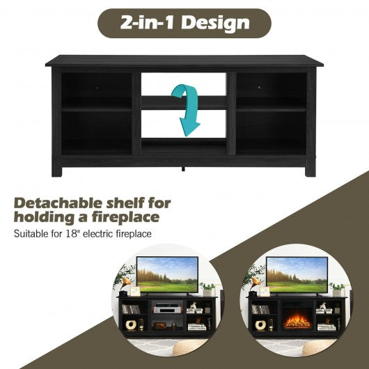 This 58" TV stand is designed to upgrade your living space which is suitable for your living room bedroom entryway and more. Made of premium engineered wood with wear-resistant melamine finish this TV cabinet features great stability and durability which can be used for a long time. The spacious desktop will fit up to 65" flat screen TVs and some decorations. 6 open shelves provide ample space to store your audio or video component equipment. What's more the central shelf can be removed to hold an 18" electric fireplace. With clean lines and exquisite appearance this media console will be a perfect addition to your home. Sit before the TV stand and enjoy your leisure time together with your family! If you are looking for a product like this. Don't hesitate to buy it! Made of solid engineered wood to ensure great stability and durability 6 open shelves provide ample storage space for media or gaming devices Spacious tabletop can hold a TV up to 65" plants photo frame and more The middle shelf can be removed to place an electric fireplace Extra board at the bottom increase stability of the TV stand Multifunctional & practical design for living room entryway etc Chic design and rustic style fit well with any home decor Smooth surface for easy cleaning with damp cloth Easy to assemble with detailed instructions Max weight capacity can reach 220 lbs