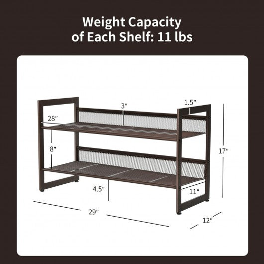 Specification: Color: Brown Material: Steel 2-Tier Product imension: 29"x 12" x 17" (L x W x H) 3-Tier Product dimension: 29"x 12" x 25" (L x W x H) 4-Tier Product dimension: 29"x 12" x 32.5" (L x W x H) Shelf dimension: 28" x 11" (L x W) Maximum weight of each shelf: 11 lbs Net weight: 13.5 lbs Package Includes: 1 x Shoe rack 1 x Instruction