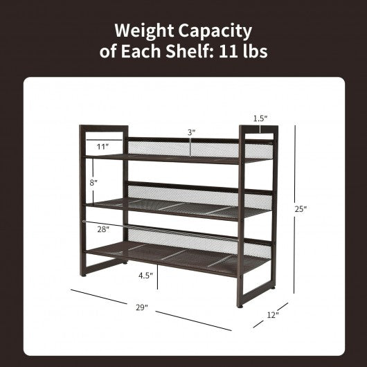 Specification: Color: Brown Material: Steel 2-Tier Product imension: 29"x 12" x 17" (L x W x H) 3-Tier Product dimension: 29"x 12" x 25" (L x W x H) 4-Tier Product dimension: 29"x 12" x 32.5" (L x W x H) Shelf dimension: 28" x 11" (L x W) Maximum weight of each shelf: 11 lbs Net weight: 13.5 lbs Package Includes: 1 x Shoe rack 1 x Instruction