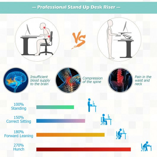Years of sedentary will directly harm the neck and spine and even cause a pulmonary embolism. Our standing desk converter is a good choice to help you develop a healthy working lifestyle. Catering to the scientific office way this sit to stand desk riser with a smooth gas spring lifting system can be easily adjusted from 4.5" to 20". The proper height will offer working comfort and posture flexibility improving your attention and productivity. Crafted of selected engineered wood and heavy-duty steel X-frame this stand up desk riser combines good stability and durability. What's more a large working platform and keyboard tray will offer ample space to place your monitor laptop keyboard and mouse. And surface protectors ensure a skid-free experience that won't damage your existing desk. Let's say goodbye to the sedentary work style! If you are looking for a standing desk like this do not hesitate to place an order! Made of high-quality engineered wood and X-shaped steel frame for years of use Adjustable height desktop from 4.5" to 20" for sitting and standing used Gas spring system with a handy handle to lift easily Spacious working area to accommodate moderately sized monitors or laptop Large keyboard tray offers enough space for keyboard and mouse An additional slot for placing phone or tablet Cable hole and adhesive clips to keep cords organized Antiskid feet and sponge pads protect the desk Portable and lightweight design easy to carry for a more efficient working Increases blood flow and reduces pains throughout the workday Max weight capacity can reach 33 lbs