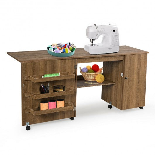 Folding Sewing Table Shelves Storage Cabinet Craft Cart with Wheels-Natural