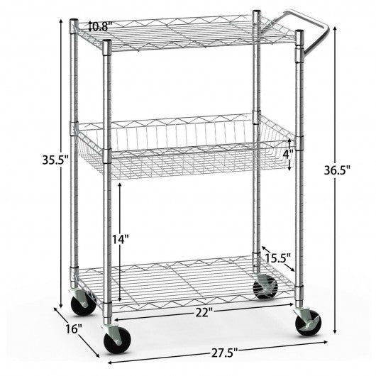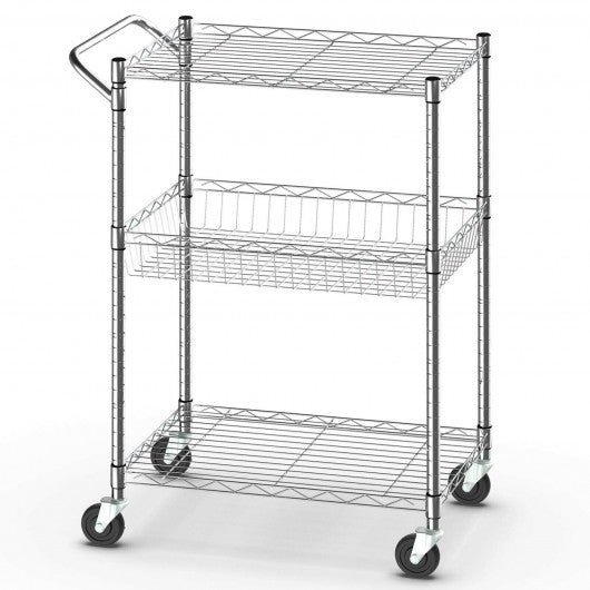 3-Tier Utility Cart Heavy Duty Wire Rolling Cart with Handle Bar Storage Trolley