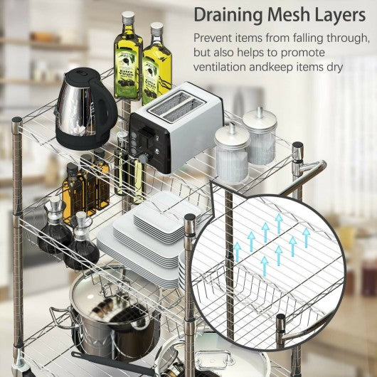 This sturdy rolling cart is a handy helper almost everywhere in your home. Use it in your kitchen for serving meals or for storing your mixer bread machine and pots and pans. It holds computer equipment in the office towels in the bathroom or tools in the garage. The three tiers offer ample space to store your household essentials. The included wheels allow for easy mobility around your home and they can be locked for your convenience. Easy to care for just wipe with a clean damp cloth to keep it looking as good as new for years to come. Our utility cart is the best choice to bring convenience to life. If you are looking for this product don't hesitate to buy it! Multi-purpose use of this durable metal utility cart 3 tier metal storage cart provides ample space 4 flexible Wheels make utility cart easy to move anywhere 2 Lockable Wheels allows cart stop in a specific place Height adjustable shelving in one-inch increments accordingly Reinforced heavy-duty steel frame provides increased stability Easy assembly with clear instruction