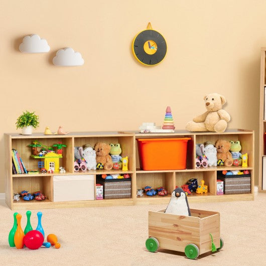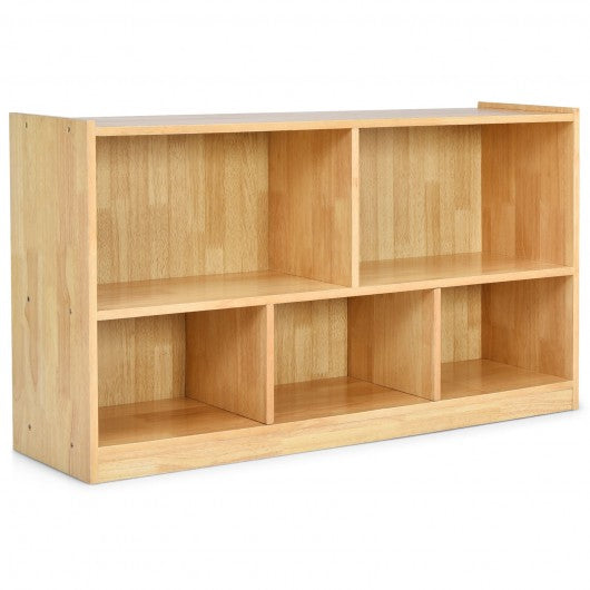 Keep your classroom or kids' room organized with this 2-tier storage cabinet! This open kids bookcase has 5 storage compartments and a spacious tabletop which can fully store children's toys books and clothes. And it is made of a sturdy wooden frame to ensure its stability and durability. The child-proportioned height makes it easy for your little one to reach items. Your kids will fall in love with the storage and develop a good habit of organizing the room independently. It can also be used as a bookcase display cabinet shoe cabinet and sideboard to put it in the living room bedroom study office kitchen and kindergarten. This 5-cube storage cabinet will create a neat space for your home. Suitable for school classrooms kindergartens playrooms and homes ASTM and CPSIA certification ensures the safety of children The bottom layer is thickened to make the structure more stable You can put items on top of it making reasonable use of space All corners are rounded to avoid scratching your child's clothes or skin Features 5 spacious compartments making it easy to store and classify toys or books Help kids form a good habit of organizing personal belongings Made of sturdy Plywood strong and stable for long-term use Natural wooden texture brings a stylish atmosphere to the home while keeping it tidy Ergonomic height setting makes it easy for children to get their favorite items Raised edge designed to prevent falling objects Easy to clean and maintain with a smooth surface Easy to assemble according to the instructions