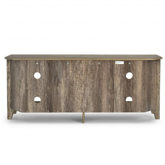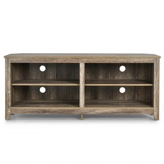 This TV console must be a piece of necessary furniture in your living room! Made of robust boards this stand can firmly hold your TV and other electronic products with exceptional stability. It is large enough to accommodate an ordinary TV with maximum size of 65". There are 4 open compartments which can provide space for DVD players game consoles CDs and other belongings making it a multifunctional media center for you. And it is also very suitable to place the TV console at a corner benefiting from its cutting corners so as to perfectly enlarge your living space. If you are looking for a TV console like this do not hesitate to place an order! Cutting design makes it easily nestles into a corner Large table top accommodates a TV with maximum size of 65” Stable structure with additional central leg for large weight capacity Smooth surface makes it easy to clean with a simple wipe Cable management holes help to organize different wires for clean environment 4-cubby design provides large storage space for electronic devices Can be used as a TV stand or a storage cabinet Beautiful wood grain brings a rustic style to lighten your house Easy assembly according to the detailed instructions