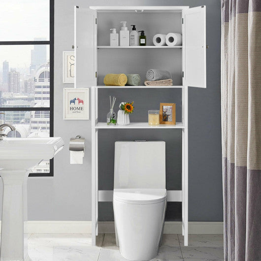 Let our bathroom space saver cabinet bring you a clean and tidy space! Our over-the-toilet storage cabinet is a great helper for organizing bathroom essentials and saving space. Adopted high-quality MDF board with reinforced screws ensures long-term stability and durability. And there is a strengthened crossbar at the bottom for reinforcement to add extra strong support. The bathroom cabinet includes a 2-door cabinet and a large open shelf which provides sufficient storage space to store sanitary supplies and sundries. What's more you can place it over the toilet or washing machine which won't take up too much ground space. Designed with modern and simple style the cabinet can also be a great decoration for your house! 2 elegant handles help you open the door easily The anti-toppling device enhances your use safety Made of high-toughness MDF board which is not easy to deform Easy to set up with detailed instructions and necessary accessories A reinforced crossbar at the bottom adds stability and avoid wobbling Comes with a large cabinet and an open shelf for storage and display Equipped with magnetic stoppers which can prevent items from falling out The 3-position adjustable shelf allows you to store items of different sizes A smooth surface with waterproof coating allows you to clean and maintain easily No need to worry about blocking the water-tap on the wall with the adjustable crossbar
