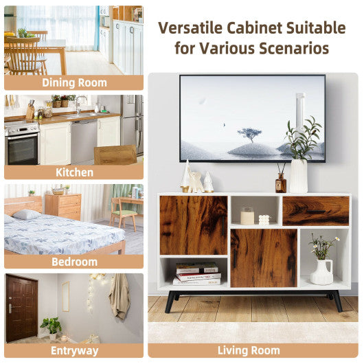 Do you want to add storage space to your house and add more brilliance? This multifunctional storage side cabinet can give you a neat and tidy home space.   This sideboard has a sleek and concise appearance in a modern industrial style bringing a simple and elegant charm which can perfectly match various room decors. Besides the storage cabinet is constructed of premium MDF boards and sturdy metal tubes which make it sturdy for long time use. And it has a large drawer 2 doors and 3 open storage compartments for multi-functional storage so that you can sort and store items to get away from clutter. The spacious desktop can be used to display decorations or to support the TV playing different roles in different rooms.   If you are looking for a buffet like this do not hesitate to place an order!   Industrial design blends perfectly into your furnishing style Multipurpose cabinet suitable for living room kitchen entryway Silent damping hinges and smooth sliding rails for ideal using experience Large storage compartments help you organize your knick-knacks Drawer and doors keep clutter out of sight and make your room tidy Durable wooden construction and metal bracket for a steady performance wide top bears up to 66 lbs and accommodates various ornaments