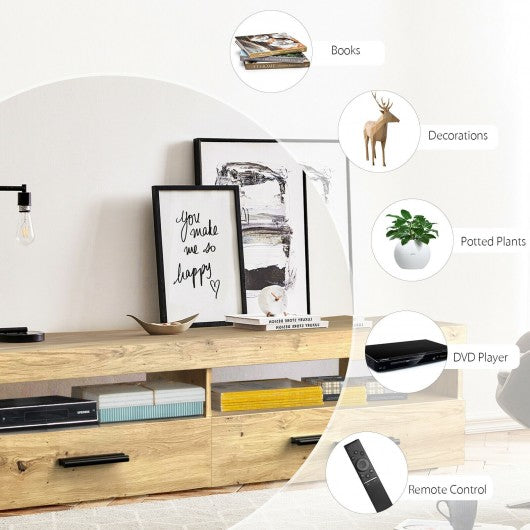 Coming with 2 large sliding-out drawers and an open storage shelf it is perfect for storing various items and getting them well organized in one place. The spacious desktop will fit the size of most flat-screen TVs up to 60 inches. Made of premium engineered wood this TV stand is solid and durable which will bring long-lasting reliable service to you. With modern style and unique design the TV cabinet perfectly coordinates with different home decorations. It is sure to add a special touch of glamour to the living room bedroom and more. If you are looking for a TV stand like this do not hesitate to place an order! The large tabletop can hold most flat-screen TVs up to 60 inch Premium engineered wood ensures sturdiness and durability 2 open compartments allow you to fetch items with ease 2 drawers provide storage space for books routers gaming equipment etc Convenient handle and metal track make it easy to pull out the drawers Non-slip foot pads protect the floor from scratches Modern style fits well with your bedroom living room and more A smooth surface is easy to clean and maintain