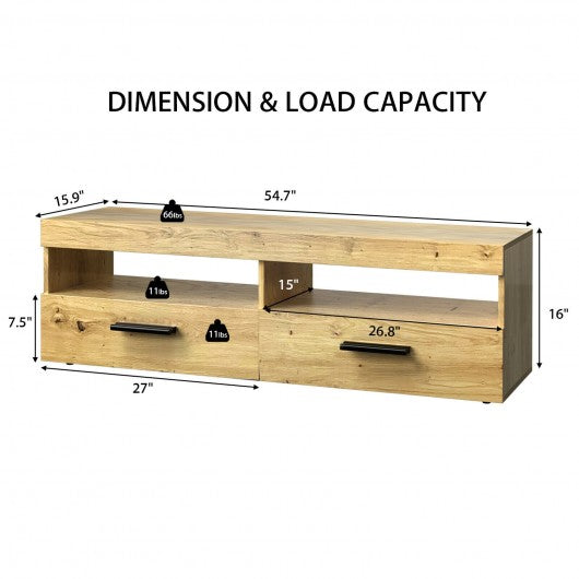 Specification: Color: Oak Material: Engineered wood Overall dimension: 54.7" x 15.9" x 16" (L x W x H) Net weight: 73 lbs Weight capacity of each drawer: 11 lbs Weight capacity of open compartment: 11 lbs Weight capacity of tabletop: 66 lbs Package includes: 1 x TV stand 1 x User guide