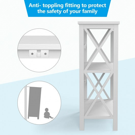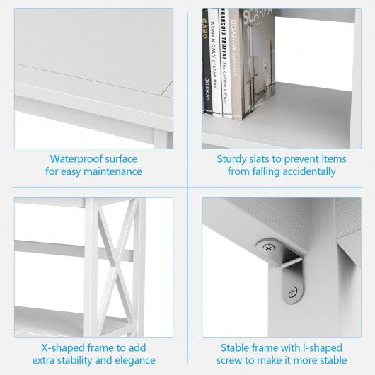 This 3-tier bookcase combines elements with utility functions to meet your daily storage needs. The x-design style bookcase with 3 tier design helps you organize your books plants photo albums collectibles and decorations without occupying much space. It uses superior solid wood and premium l-shaped metal connector for long service life. And the contemporary x-frame gives this bookshelf a stylish chic look that prevents books from falling. Due to the anti- toppling fitting you don’t have to worry about the bookcase falling down accidentally and hurting your family. What's more the simple construction with smooth surface makes your installation and cleaning work more convenient. It is perfect for various occasions such as living room bedroom home and office. If you are looking for a chic 3-story bookshelf like this do not hesitate to place an order! Large open shelf offers enough space for your belongings Sturdy frame with l-shaped screw for long-lasting use 4 solid legs add additional load capacity and support X-shaped keeps your items in a safe place without falling Anti- toppling device avoids accidental fall and turnover Modern appearance highlights your space and home decor Smooth and waterproof surface for easy maintenance Quick Installation with detailed manual and required parts