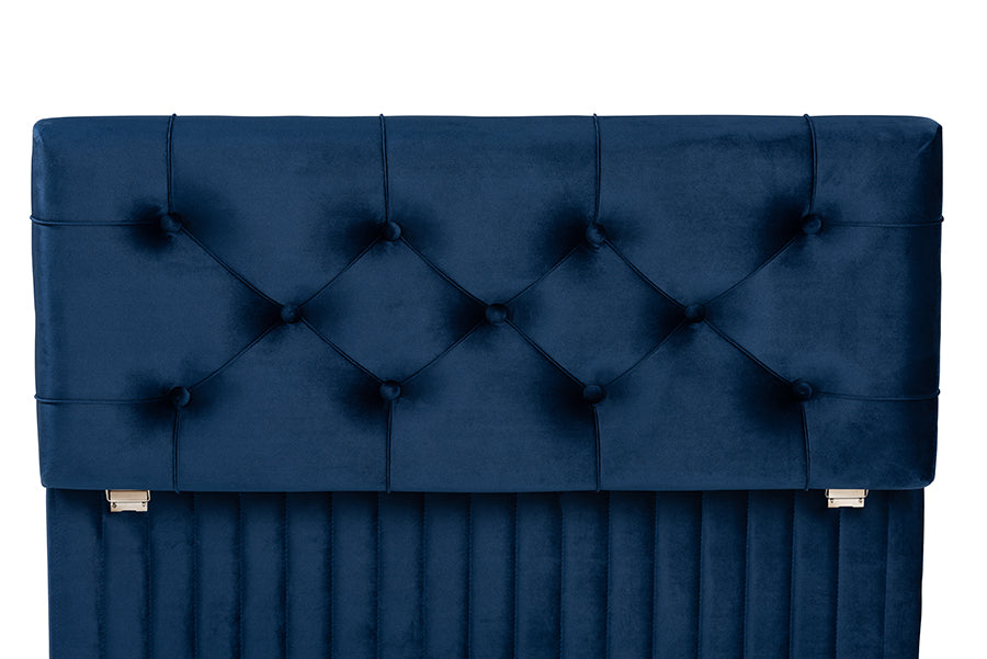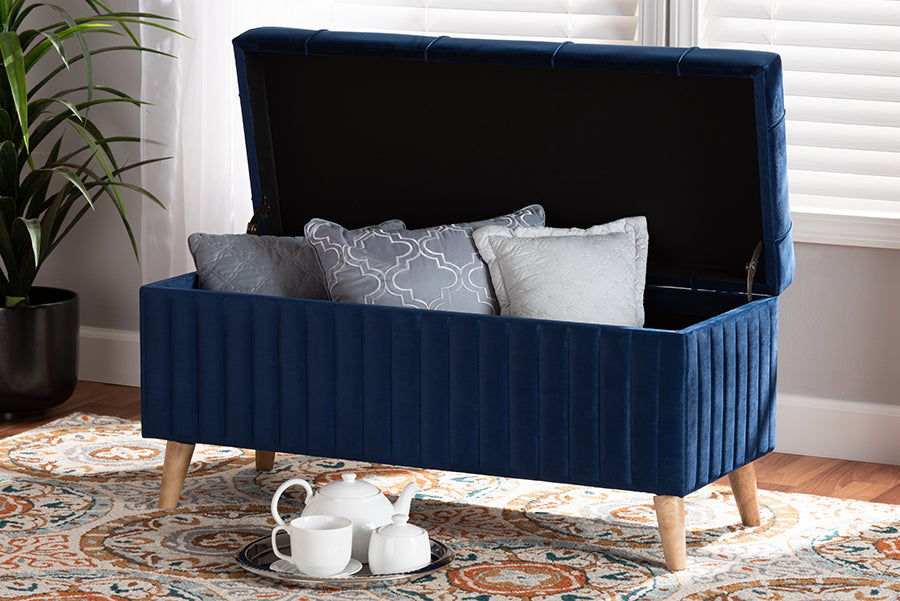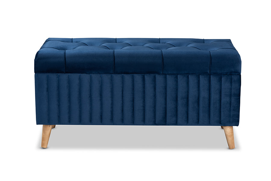 Baxton Studio Hanley Modern and Contemporary Navy Blue Velvet Fabric Upholstered and Walnut Brown Finished Wood Storage Ottoman