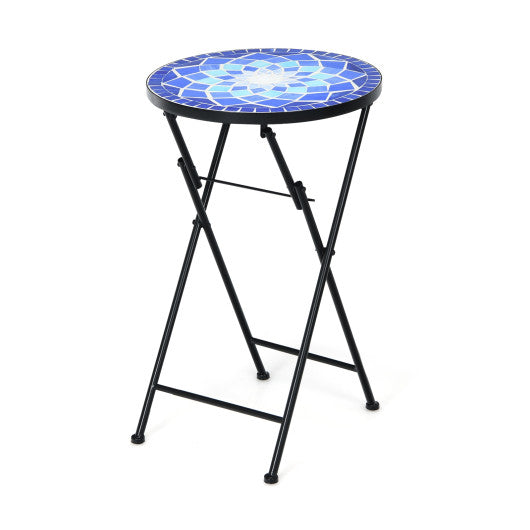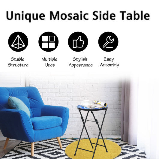Lighten up your indoor and outdoor occasions with this mosaic side table! The side table comes with beautiful mosaic pattern and ceramic tile top that add a unique charm to your home. It is smartly made to be placed at any small spaces like the corner of your patio or perfectly fit any large space. Folding design also brings much convenience to store and carry around. The steel construction with anti-rust coating makes this table sturdy and durable. The table can be also used for plants to decorate your space or placed beside the sofa as a side table. Moreover it is a perfect choice to set a coffee when combined with a chair to create a cozy area. If you are looking for a mosaic side table like this do not hesitate to place an order! Exquisite mosaic pattern serves as a good decorative ornament Unique ceramic tile top fits well with different room styles Used as a patio plant stand porch side table end table Combined with existing garden seating to enjoy leisure time Solid steel frame features sturdiness and durability Anti-rust coating can withstand all kinds of weather 14” round side table gives you enough space to hold plants books etc Non-slip foot mats enhance the stability of side table Perfect addition for living room garden backyard balcony etc Easy to assemble under the guidance of instruction