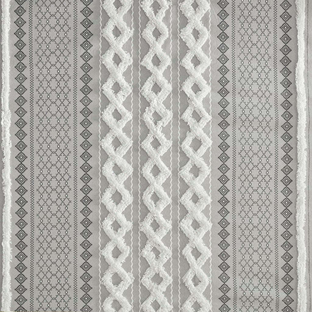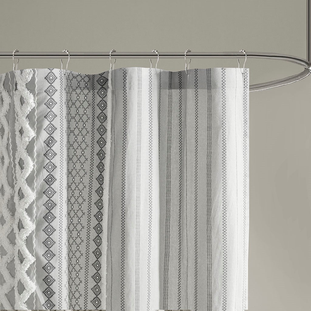 Elevate the look of your bathroom with the INK+IVY Imani Cotton Printed Shower Curtain with Chenille Stripe. This 100% cotton shower curtain features a grey globally inspired Aztec print with a cotton chenille trim that adds a sophisticated touch. Finished with 12 button holes at the top, this shower curtain is machine washable for easy care. Coordinating bedding set is available and sold separately.