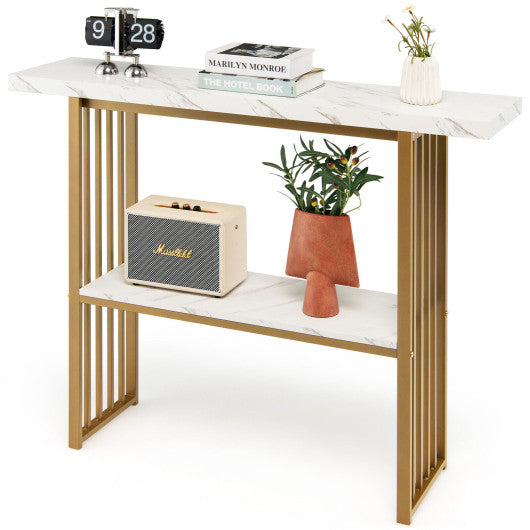 This console table perfectly combines an elegant design and sufficient storage. Its gold frame is composed of thicken steel tubes which is not only rustproof for durability but also sturdy for a strong load capacity. More two faux marble shelves are made of P2 MDF presenting an extended service life. What’s more the console table is fitted with an anti-toppling device to avoid sudden tipping which is very suitable for family with kids. The anti-slip pads highly avoid scratches on the floor. Depending on your needs the 48" x 11.5" x 36.5" console table can work well as a sofa side table an entryway table a dining room shelf or a kitchen shelf. If you are looking for a console table like this do not hesitate to place an order! Wide countertop and open shelf for storage addition P2 MDF and steel frame for an enhanced load capacity Stable and safe using is ensured by anti-toppling kit and anti-slip pads Long shape is space-saving for small rooms Faux marble surface and gold frame for decoration Applicable to living room dining room entryway and more Hassle-free installation with clearly clarified instruction