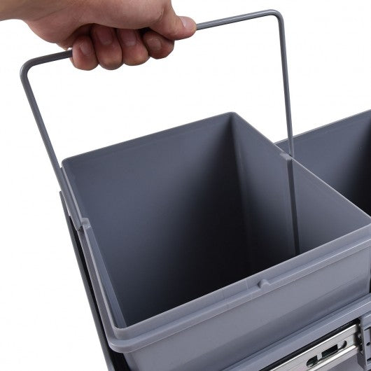 It has two separate compartments so that nothing gets mixed up. This bin is ideal for the home and has a heavy-duty frame for durability. The easy pull-out design allows you to sort trash into sturdy PP bins. Use this Recycling Bin to sort recyclables and non-recyclables. Don�t hesitate to buy one to make your kitchen neater! Brand new and high quality Smooth sliding way Easy pull-out design Durable ABS shell and PP inner compartment Convenient carry handles on inner drum Kitchen will be neater for built-in trash Easily remove the inner drums to clean them and dispose of contents Assembling required: No