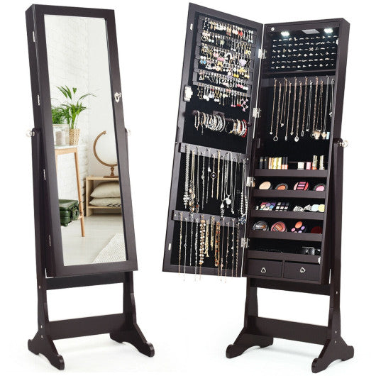 Lockable Mirrored Jewelry Cabinet with Stand and Led Lights-Brown