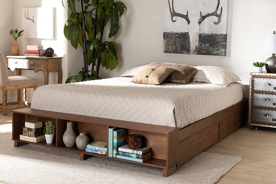 Baxton Studio Arthur Modern Rustic Ash Walnut Brown Finished Wood Queen Size Platform Bed with Built-In Shelves