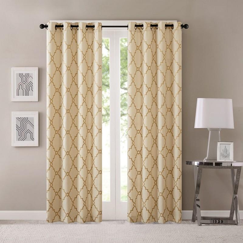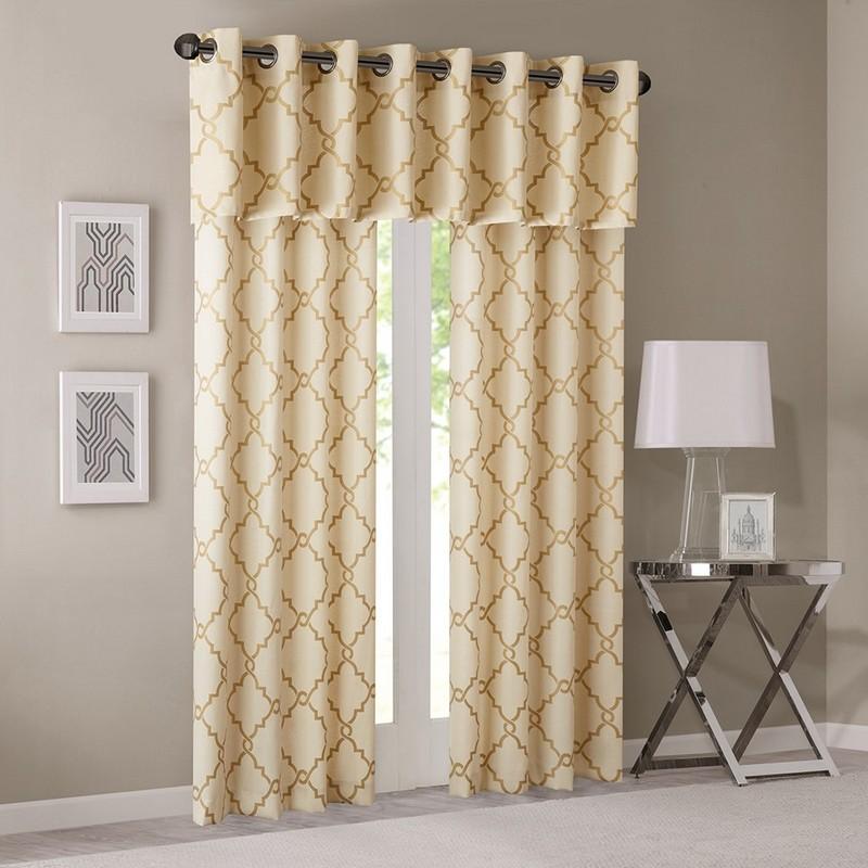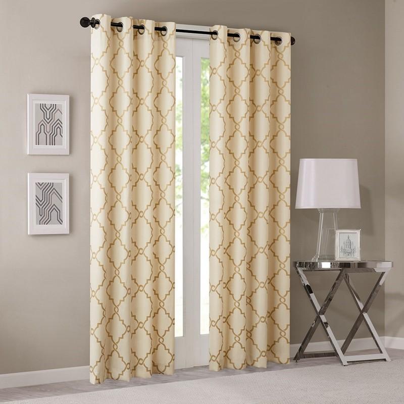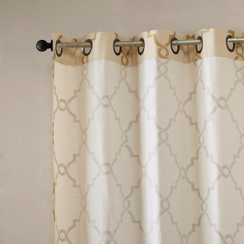For a casual and stylish update, our Madison Park Saratoga Fret Print Window Curtain is the perfect addition to any decor. This window panel features a trendy metallic gold fretwork on a soft beige ground, creating a simple yet modern look. The cotton blend basket weave fabric softly filters the perfect amount of sunlight into your home, while providing texture for natural appeal. Silver grommet top detail makes this panel easy to hang, open, and close throughout the day. Fits up to a 1.25" diameter rod.