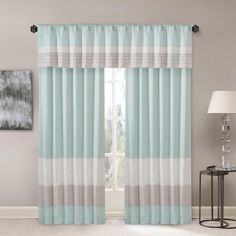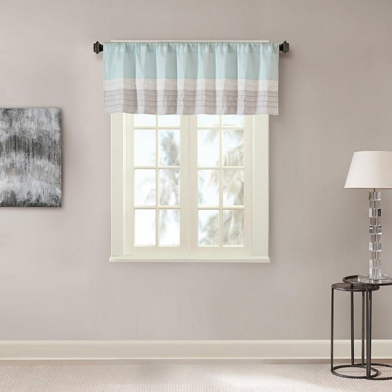 Amherst's modern color block design is a simple way to add style to any room. This window valance features color block stripes in soft hues of aqua, grey, and ivory combined with pintuck detailing for beautiful texture and dimension. Added lining helps to filter the perfect amount of light and creates a fuller look. Hang using the rod pocket top. Fits up to 1.25" diameter rod.