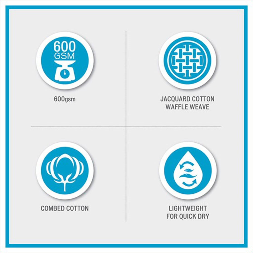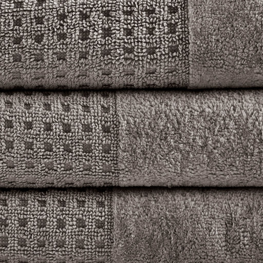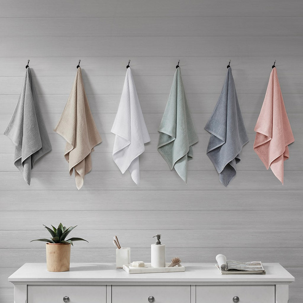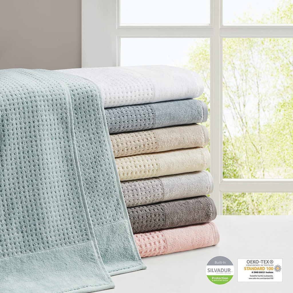 Our Madison Park Spa Waffle Cotton Towel 6 Piece Set provides the perfect textured update to your bathroom decor. This 100% cotton towel set features an all-over waffle combed jacquard design for a rich texture, while the velour dobby cuff adds a stylish contrast touch for an updated look and feel. The 600gsm weight makes each towel soft yet also lightweight and quick-drying, so it does not get weighed down from moisture throughout the day. These towels are also finished with a SILVADUR antimicrobial treatment providing built in freshness protection, inhibiting growth of odor causing bacteria, and keeping linen newer, longer. Active for multiple washes, this treatment delivers long-lasting durable odor protection performance. In addition, this towel set is also OEKO-TEX certified, meaning it does not contain any harmful substances or chemicals, ensuring quality comfort and wellness. Complete the look with coordinating Spa Rug and Spa Waffle Shower Curtains, available and sold separately. Set includes: 2 standard 28x54" bath towels, 2 standard 16x26" hand towels, and 2 standard 12x12" wash towels.