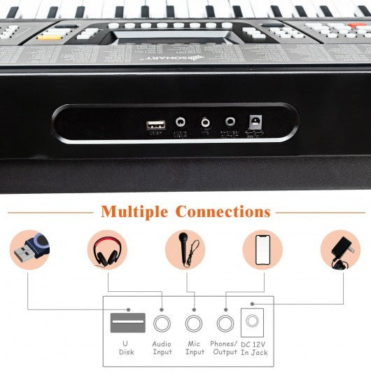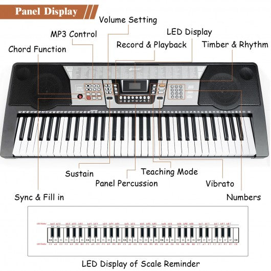 The 61-key electronic piano keyboard is the perfect answer for the aspiring musical master with limited floor space. 255 Timbres 255 rhythms 61 keyboard percussions 8 panel percussions and 24 demonstration songs aim to expand your skills and experiencing different awesome music effects. 3-Step teaching mode and clear LED display are convenient for beginners to practice and learn piano skills. Sustain and vibrato single-finger and multi-finger chords help you play more skillful and perfect music. Headphones microphones and MP3 control allow you to immerse yourself in the world of music without disturbing others. Both the adapter and 6AA batteries (not included) can power the electronic piano. The keyboard package provides an adjustable iron stand that can be used for electronic organs of different sizes. Meanwhile the padded stool is adjustable in height so you can play comfortably for several hours. Do not hesitate to buy ut for your children! They will love it! Include 255 Timbres 255 rhythms 61 keyboard percussions and 8 panel percussions 24 demo songs headphones microphones and MP3 controls for more fun Sustain and vibrato single-finger and multi-finger chords to learn more skills The 3-step teaching mode allows beginners to easily learn music performance Record and playback function to record your inspiration LED display enables to prompt the scale for novices Various interfaces are used to connect different external devices Full-size keyboard comfortable to play and suitable for practice Dual power supply methods: adapter included and 6 AA batteries (not included) Sturdy iron stand and padded stool height adjustable for different needs Capable to be connected with Udisk for different need of music creation