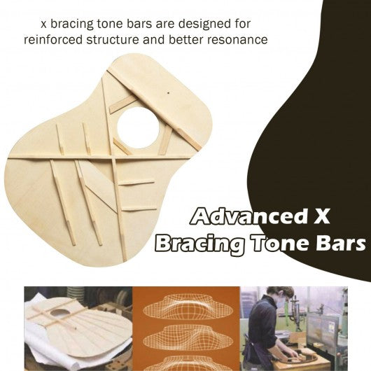 Take a 40-in full size guitar with optimal sound quality to yourself and enjoy a colorful leisure time. This acoustic guitar features a unique cutaway design which strikes perfect balance between convenient play ability and charming appearance. It is not difficult to reach the high frets any more. Richer sound and better resonance matter a lot. Therefore the folk guitar chooses advanced X bracing tone bars to provide bright warm and clear tones. Thanks to the high quality steel string and lower string action you will feel comfortable when pressing the strings. In order to achieve precise tune it also comes with electric clip-on tuner. Some other essential beginner accessories are included to help beginners students and music lovers start their music journey. If you are looking for the acoustic guitar like that don't hesitate to buy it! Cutaway shape makes it easier for you to play high notes Reinforced X bracing structure for better resonance and richer sound Fully sealed tuning pegs keep the guitars playing in accurate tune Rust resistant steel strings for higher durability superior to nylon ones The LCD screen of electric tuner shows green color when the guitar in tuning Come with allen wrench to help adjust the built in truss rod for right string action Perfect string action for comfortable playing feeling with less fingertip fatigue Beginner-friendly complete accessories give more convenience in guitar learning Carrying bag and shoulder strap for convenient portability Ideal gift for starters professional music lovers of all ages