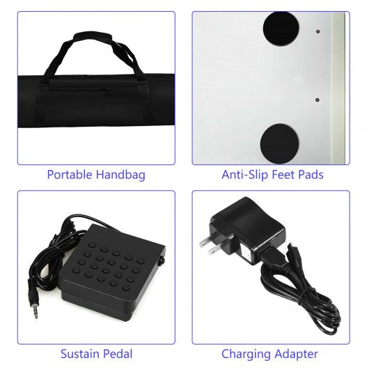 Specification: Color: White / Black Keyboard material: Abs aluminum alloy Case material: Oxford cloth Keyboard dimension: 34.5" x 7" x 2.5" (L x W x H) Case dimension: 35.5" x 7.5" x 3" (L x W x H) Output power of piano: 500 MV Input power of charger: 110 V Charging time: 4 h Playing time: 12 h Net weight: 8 lbs Suitable age: 3+ Package includes: 1 x 61-key digital piano 1 x Case 1 x Charger 1 x Sustain pedal 1 x User manual