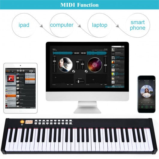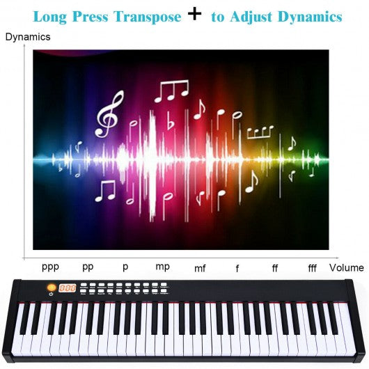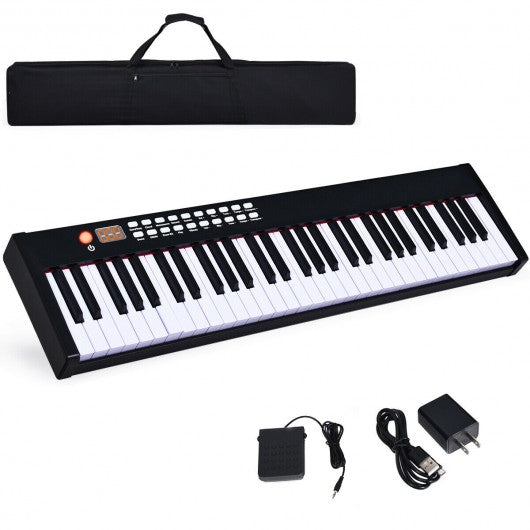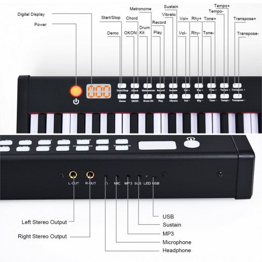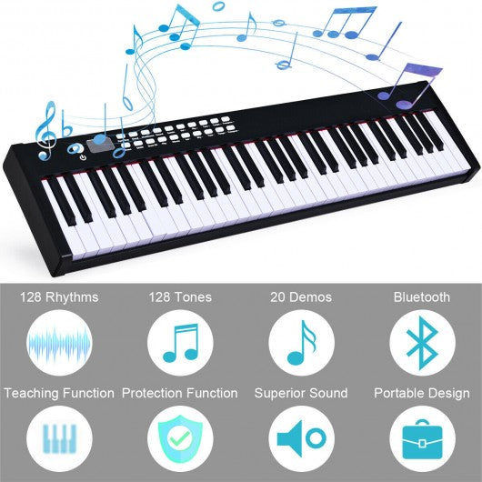The BX-? 61-key digital piano keyboard will be a perfect musical instrument whether for beginners or experienced musicians which takes up less space. Full-Size touch sensitive keys are perfect for your practice or performance. Teaching function helps you learn different kinds of songs and practice your chords. Sustain pedal allows you to make your notes fade gradually or stop suddenly. Besides thanks to 2 external speakers you will hear more realistic stereo sound. You can also choose to enjoy playing piano keyboard quietly by connecting headphones to eliminate distractions. Coming with a carrying case the keyboard with portable design enable you to put all accessories together and carry them wherever you want. BX? piano keyboard features better performance 128 Rhythms 128 tones for multiple sound settings MIDI interface allows connection to different smart devices Full-Size keys bring full-bodied sound of piano 2 External speakers ensure realistic stereo effect and higher volume Touch sensitive keys helps you play more attractive piece Digital tube display the currently used functionality Long battery life up to 12 hours after 4 hours charging Secure material and ASTM certification guarantee reliable usage Portable carrying case for space saving and convenient storage Sustain pedal lets you adjust the impact of notes Recording function help you play back your piece and to make improvements