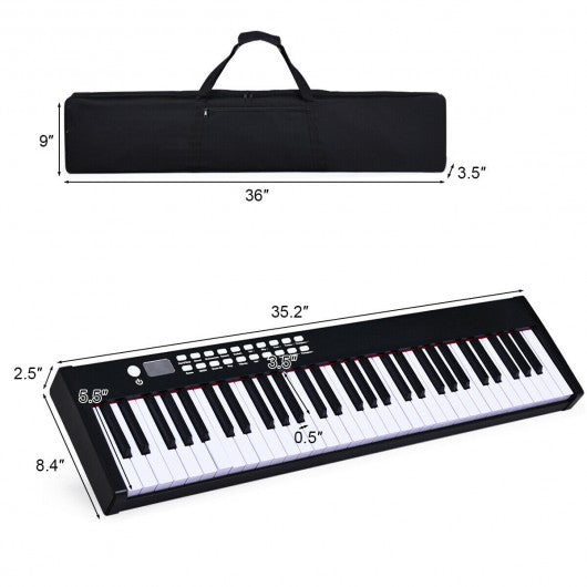 Specification: Color: Black Keyboard material: ABS aluminum alloy Case material: Oxford cloth Keyboard dimension: 35.2" x 8.4" x 2.5" (L x W x H) Case dimension: 36" x 3.5" x 9" (L x W x H) Output power of piano: 500 MV Input power of charger: 110 V Charging time: 4 hrs Playing time: 12 hrs Net weight: 11 lbs Suitable age: 3+ Package includes: 1 x 61-key digital piano 1 x Case 1 x Charger 1 x Sustain pedal 1 x User manual