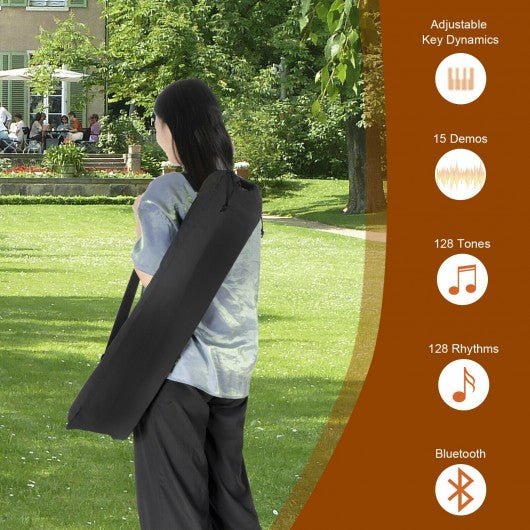Unlike another ordinary piano keyboard this digital piano keyboard gives you a whole new playing experience. It features a unique attachable design which means you can detach it into 2 piece 44-key keyboards or attach it for a complete 88-key keyboard. More the perfect combination of full-size keys and dual stereo speakers deliver a wonderful piano-style performance. 128 Rhythms and 128 tones allow the kids music lovers beginners to explore the piano world. Bluetooth function MIDI function record function and teaching function make the keyboard stand out. There is a sustain pedal as well to make a better performance. Many other functions such as adjustable volume different ports etc are waiting for you to discover. Rechargeable 1000mAh battery is capable of lasting for 12 hours running time after a full charge which makes it possible to play piano keyboard outdoors. Store the keyboard in the portable bag and carry it anywhere you want. If you are looking for this product don't hesitate to place an order! Can be detached into 2 piece 44-key piano keyboards or attached to 1 88-key keyboard Only the main part can be used when detached into 2 pieces 44-key keyboards Full-size keys with wooden texture surface for a better playing experience Dual built-in style external speakers for stereo effect Featured with a sustain pedal Bluetooth record teaching MIDI functions 128 Rhythms and 128 tones allow you to create fabulous original music Different charging types adapter or power bank up to 12-hour running time after a full charge Come with a carrying bag for space-saving storage and convenient storage Headphone connectivity for music enjoyment without disturbance to others The dynamic adjustment can be easily achieved by long-pressing the transpose+ button Perfect for 3+ kids beginners music lovers performers etc