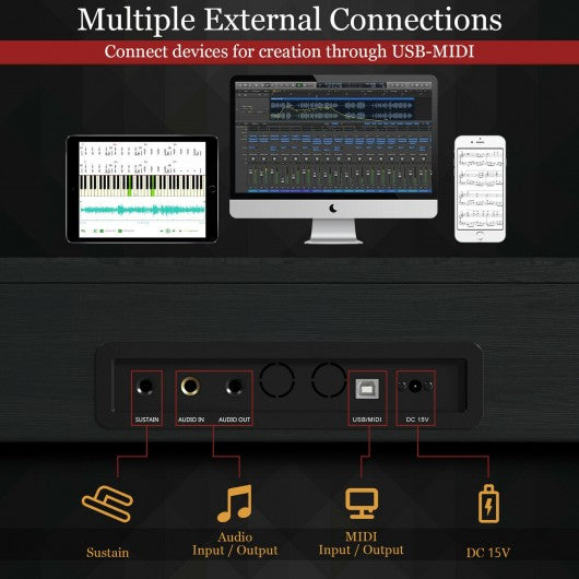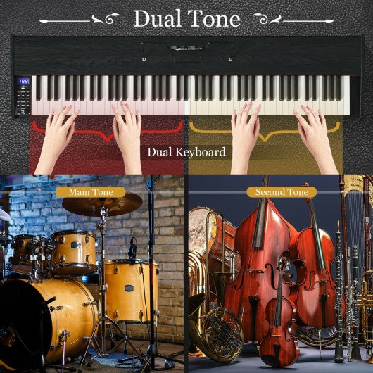 The 88 key weighted keyboard with dual-tone modes combines two voices together like piano and drum inspiring users to make new creations as well as providing users with acoustic timbre and a wonderful playing experience. In addition our piano has 800 tones 600 rhythms 64 polyphonies and 80 demos for users to choose from. And recording and following-playing functions can facilitate your intelligent learning. In order to improve learning efficiency we added MIDI/USB interface and Bluetooth to connect the piano to electric devices. Apart from that headphones two 10W built-in speakers and single sustain pedal provide users with professional playing experience. If you are looking for a weighted 88-key digital piano,Please take it home! 88 full size weighted hammer action keys bring real piano playing experience Dual tones can meet the needs of different tones 800 tones 600 rhythms 64 polyphonies and 80 demos for multiple sound settings MIDI & USB interfaces allow connecting different smart devices Bluetooth to connect smartphone for more lessons Headphone included enables you to listen to your own music without disturbing others Two 10w of built-in speakers are conveniently located for an optimal listening experience Professional single sustain pedal help users to play real piano performance Wooden materials look more textured Dynamical adjustment helps you play more attractive piece Panel includes digital LED display Udisk port power adjustable volume and function buttons Recording and following-playing functions facilitate your intelligent learning Piano cover ensures its dirt-resistance Certificated by ASTM safety usage for your children