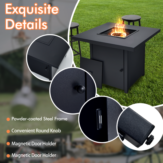 The 32" gas fire pit table is an ideal addition to your patio and other outdoor living space. Due to the detachable lid this propane fire pit table can be easily converted into an outdoor coffee table to place some daily items. You can choose to cover or remove the lid according to your preference. When you remove the lid this outdoor fire table provides comfortable warmth and beautiful flames because of its 40 000 BTU ignition device rotatable control knob stainless steel burner and fire glass. What's more the CSA certification ensures safety while using. If you are looking for a gas fire pit table like this do not hesitate to place an order! Brings sufficient warmth thanks to its 40 000 BTU Ensures security because of its CSA certification Creates a clean and comfy environment with smokeless design Mesmerizing flames and beautiful fire glass for attraction Rotary control knob for flame adjustment Uses as an outdoor fire table or coffee table with removable lid Can be used for a long time with anti-rust steel frame Ideal for different outdoor places such as patio backyard and garden etc Suitable for 20 lbs LP gas tank (not included) Easy access door with handle for propane tank exchange Built-in fixing hoop for keeping the LP gas tank firmly Detailed instruction for easy assembly