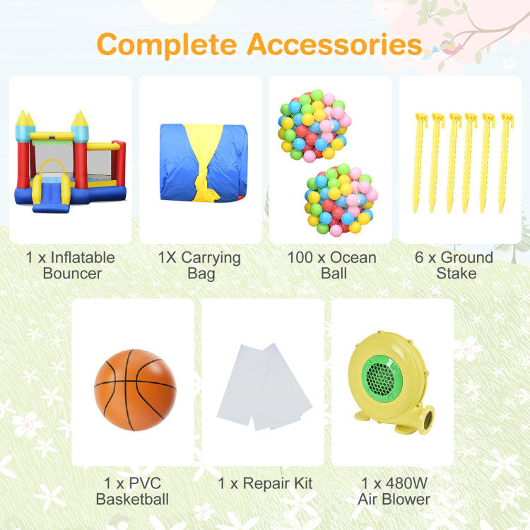 Set up a funny playhouse at home and give your kids a big surprise! This inflatable bounce house will impress your kids with its bright colors castle-like design and multiple playing areas. It allows kids to jump slide shoot basketball (included) and chase freely between the 2 bouncy areas making them indulge for hours. Besides the bonus ocean balls will add much fun. And there is also a hand pump a carrying bag a repair kit and 6 ground stakes in the package which will help you with the setup storage and maintenance of the bounce castle. What's more the surrounding mesh walls facilitate ventilation and ensure safety when kids are playing inside. And a 480W blower is provided for you to blow up the castle and enjoy the fun right away. If you are looking for such an inflatable bounce do not hesitate to take it to your home! Features several playing areas to entertain kids for hours With bonus inflatable basketball and ocean balls for much fun Comes with a hand pump a carrying bag a repair kit and 6 ground stakes Mesh walls surrounds the castle to protect kids and promote ventilation Durable oxford cloth and exquisite stitching ensure the long service life Easy to set up and take down the inflatable bouncy castle The bouncy area can support 300 lbs (3 players under 100 lbs) Recommended for 3-10 years old kids The 480W blower helps you quickly set up the castle