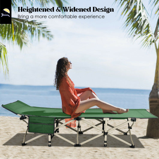 Enjoy better relaxation with this camping cot anywhere and anytime! This folding camping measures 75" x 28.5" x 20" (L x W x H) and loads up to 882 lbs which provides large space and strong support for a more comfortable and relaxing sleeping experience. The 6-point structure and X-shaped support improve overall stability and prevent wobbling or tipping over. And the steel tubes are covered by anti-rust and waterproof powder coating allowing for long-time outdoor use. Besides the head of the sleeping cot with the slanted design can fully relieve your neck back and shoulder pain. The lounge cot is made of premium oxford fabric that is tear and wear-resistant weather-proof and high-elastic ensuring ultimate comfort. Thanks to the anti-slip and anti-sink footpads the sleeping cot can stand firmly whether in the sand or mud. Other than that this portable camping cot is easy and quick to fold and unfold and you can store it in a carry bag for convenient transportation! If you are looking for such a portable bed do not hesitate to take it to your home! The 6-point stable structure and X-shaped support ensure a large loading capacity of 882 lbs The high-quality square tubes increase the contact area to make the force evener The slanted head design can relax your head and neck enjoying a full-body relaxation The heightened and widened design brings a more comfortable experience Made of qualified oxford fabric breathable waterproof wear and tear-resistant durable The heavy-duty powder-coated steel tubes are rust-resistant weather-proof and durable The anti-slip and anti-sink footpads can protect the cot from sinking into the sand or mud With a carry bag you can carry and transport it easily and conveniently The side storage pocket allows you to get your belongings within reach The portable camping cot can be folded and unfolded in seconds