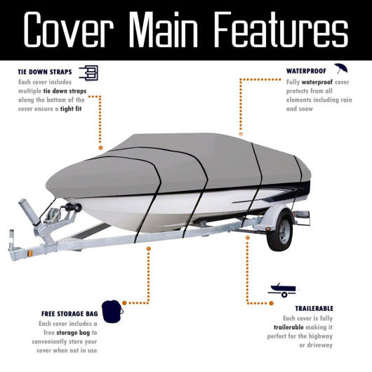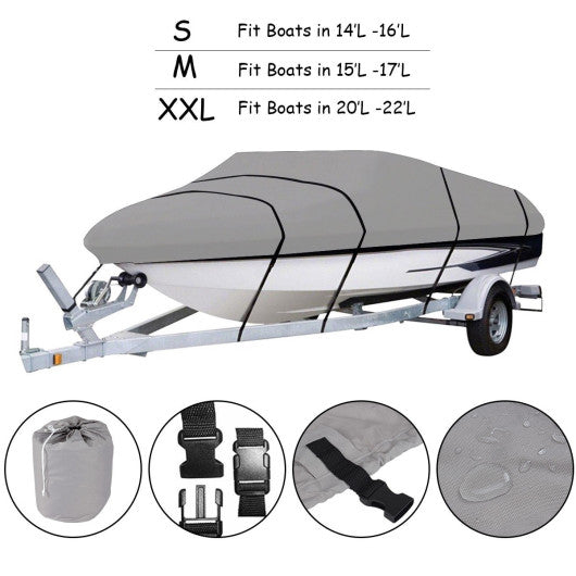 Specification: Material: 600d oxford pu coating Color: Grey Three sizes available: OP3387-s: Size: 168"-203" x 84" Weight: 8 lbs fits boat sizes (H. P.): 14'-16' OP3387-m: Size: 204"-210" x 116" Weight: 9 lbs fits boat sizes (H. P.): 15'-17' OP3387-xxl: Size: 240.5"-284" x 137" Weight:13 lbs fits boat sizes (H. P.): 20'-22'