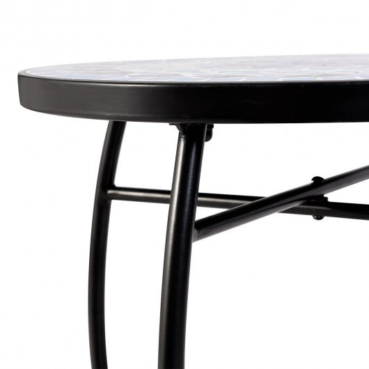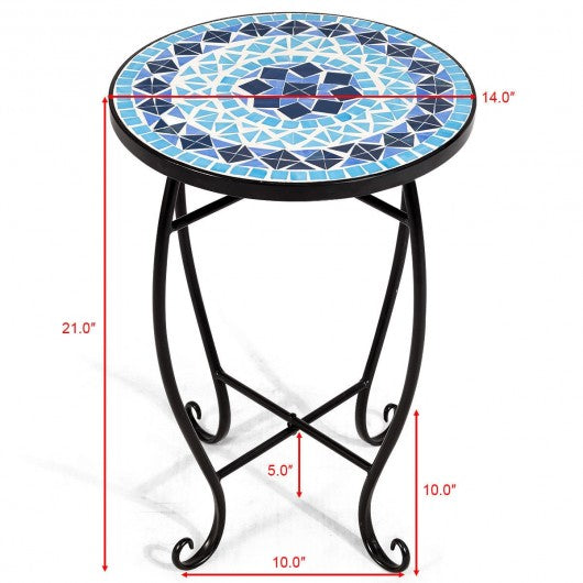 This round accent table would be a good choice for your plants. It features an inlaid glass mosaic top with a deep colorful scheme. The frame and curvaceous legs are constructed of black finish steel that will withstand the elements. It can be as a porch or patio piece plant stand indoor accent or bistro table. It is a perfect spot for drinks books or plants. A masterpiece to add charms to your living room bedroom kitchen patio and garden. Are you looking for a outdoor accent table for your plants? Don't hesitate to buy it now. Brand new and high quality Lightweight construction Black finish metal construction with graceful curved legs Features round glass top with deep cobalt blue color scheme tile mosaic inlay top Perfect spot for drinks books or plants Coated metal frame for rustproof Suitable for both indoor and outdoor usage Assembly requirement