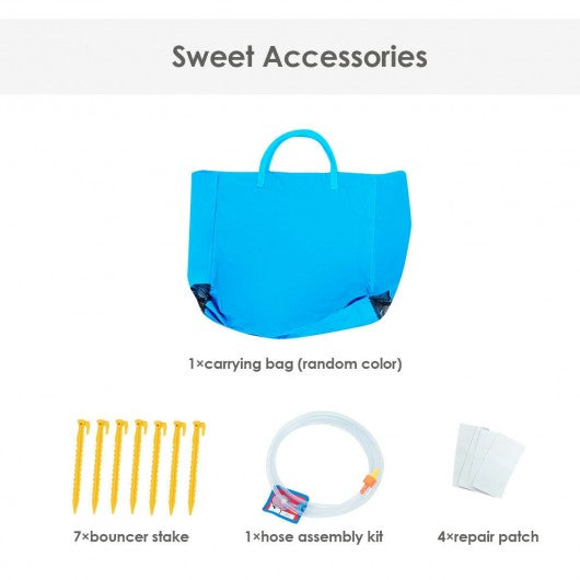 This inflatable water park is a perfect gift for children to spend leisure time. Features a slide a splash pool a climbing wall and a jumping area children can not only enjoy multiple pleasures but also exercise their balance. The mesh walls around the Jumping area ensure the children's safety while playing and satisfies the ventilation requirement well. Come with a hose the inflatable castle can be used as a water park to make children feel cool even on the hottest summer. Made of wear-resistant oxford materials it is durable enough to bring continuous happiness to children and will accompany them a long time. In addition with a carry bag you can take the inflatable water slide to anywhere you want and other sweet accessories also give you some help. If you are looking for a inflatable Bouncer don't hesitate to buy one! The bouncer stakes will add the stability to the inflatable castle Bright colors are more attractive to children Suitable for many places such as garden lawn park and so on Made of premium oxford materials long life span Warning label showing many notices for safety Easy transport and storage with a carrying bag With a hose add the water spraying function Multiple play areas bring multiple pleasures Mesh walls to protect children's safety With a repair kit for easy maintenance Quick inflation and deflation in a few minutes