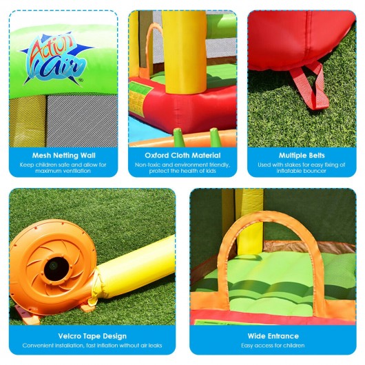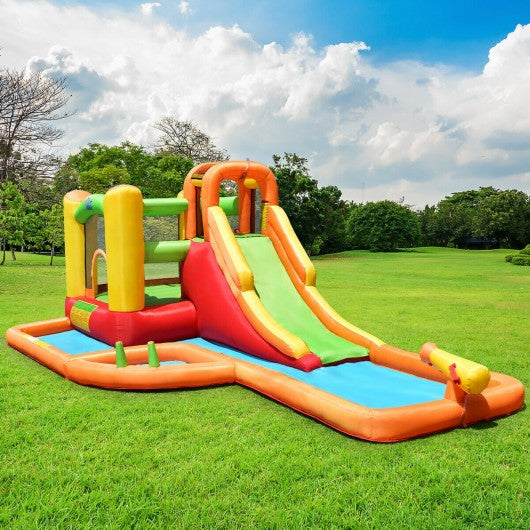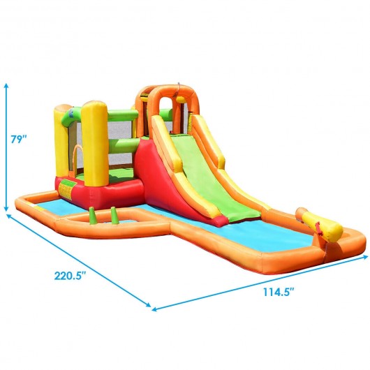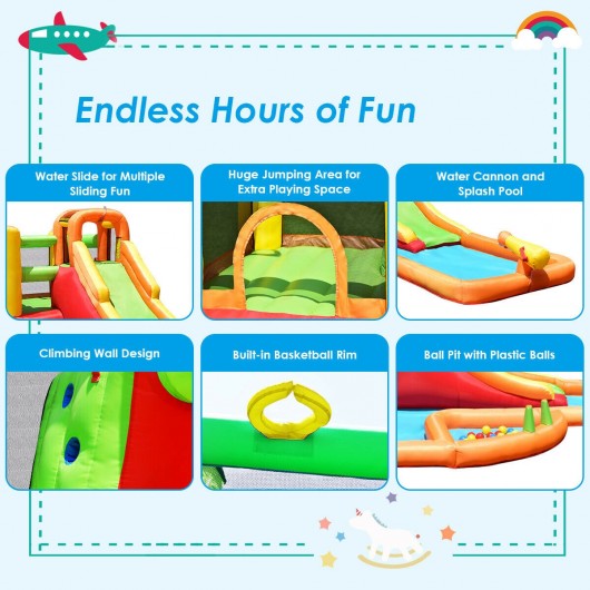 This inflatable water slide is a perfect gift for children to spend leisure time. Features a water slide a huge jumping area splash pool ball pit climbing wall basketball rim and water cannon children can not only enjoy multiple pleasures but also exercise their balance. The mesh walls around the jumping area ensures the children's safety while playing and satisfies the ventilation requirement well. Comes with a hose the inflatable castle can be used as a water park to make children feel cool even on the hottest summer. With a 780w blower so you just have to wait a few minutes the inflatable castle can be quickly formed. Don't hesitate to buy one! Made of premium oxford materials with a pvc coat wear resistant The addition of stakes will add the stability of the inflatable castle and blower Splash pool has a water plug for water storage and discharge A combination of colors attracts your child's attention quickly Suitable for many places such as garden lawn park and so on Warning label showing many notices for safety Easy storage with a carrying bag With a hose add the water spraying function Multiple play areas bring multiple pleasures The blower is ul certified and safe to use Suitable for 5 kids play together Colorful plastic balls add to the fun Mesh walls to protect children's safety With a repair kit for easy maintenance Inflate and deflate quickly
