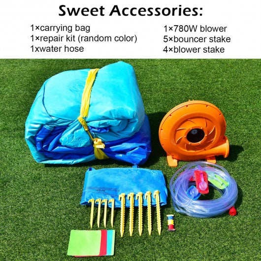 This inflatable water slide is a perfect gift for children to spend leisure time.   Features two water slides splash pool climbing wall basketball rim water cannon and easy-to -pass tunnel children can not only enjoy multiple pleasures but also exercise their balance. The mesh walls around the connecting area ensures the children's safety while playing and satisfies the ventilation requirement well. Come with a hose the inflatable castle can be used as a water park to make children feel cool even on the hottest summer. With a 780w blower so you just have to wait a few minutes the inflatable castle can be quickly formed. In addition the intimate accessories can also give you more help.   If you are loonking for a bounce house don't hesitate to buy one!   The addition of stakes will add the stability of the inflatable castle and blower Splash pool has a water plug for water storage and discharge A combination of colors attracts your child's attention quickly Suitable for many places such as garden lawn park and so on Made of premium oxford materials wear resistant Warning label showing many notices for safety Easy transport and storage with a carrying bag With a hose add the water spraying function Multiple play areas bring multiple pleasures The blower is ul certified and safe to use Mesh walls to protect children's safety With a repair kit for easy maintenance Suitable for 6 kids play together Inflate and deflate quickly
