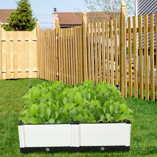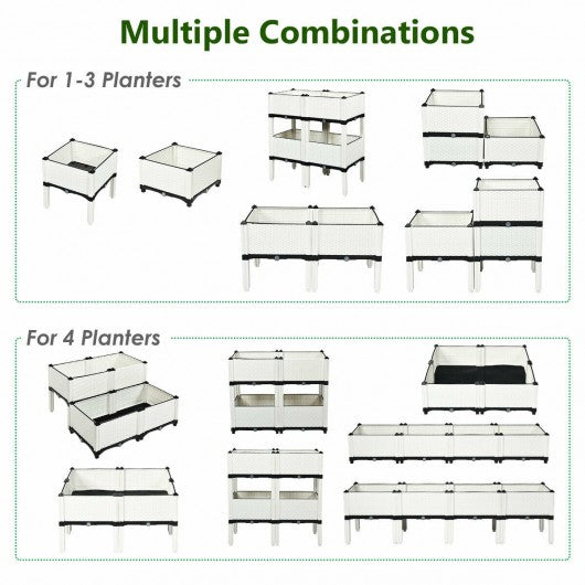 The planter bed is a good place to start developing your skills and experience the joys of growing your own plants. Constructed of high-density polyethylene (HDPE) the planter box is solid and weather-resistant to withstand the change of weather. There are 4 planting boxes for you to setup in different shape. The height of garden bed is about 17 inches (include brackets) which can protect your plants from garden animal and pests. With our planter you don't have to bend over or kneel for long time to grow plants and reduce pain on your back and knee. Elevated garden bed is designed with self-watering disk and drain holes to provide extra space for reserving water and help plants to absorb entirely. It can prevent plant from rot or over-drying effectively.Not only can these garden beds with rattan style help you grow plants but they also are nice decorations in your outdoor space. It is perfect to put them in your patio garden and balcony. High-density polyethylene is sturdy and not easy to be deteriorated by weather Drain the extra water with plugs on the four sides of planter Self-watering disk ensures oxygen and water to penetrate into roots completely Lightweight design of planter for moving to other place easily Perfect for growing vegetables flowers and herbs Create different shape with our four planter boxes Don�t need to bend or squat for long time to plant Great d�cor for your patio garden balcony and yard Easy to assemble according to instructions without other tools