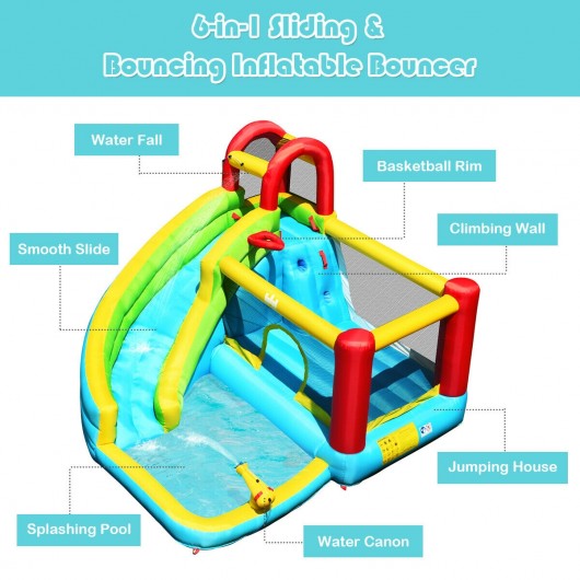 Features bright color and various playing area this funny and durable inflatable water slide is the perfect choice for your little ones in summer days. With the water slide your children can't wait to explore this wonderful water park. The built-in water cannon and secret shower hose will spray water that definitely creates surprises and endless fun. Climb up the wall bouncing on the net protected house and slid down to the pool your kids will never be board during summer time. When not in use just roll it up and store it in the utility room that leaving you no worries. If you are looking for a water slide like this don't hesitate to buy it! Bright colors and attractive appearance perfect for summer Heavy-duty puncture-resistant oxford cloth for durability Easy and quick inflation and deflation in a few minutes Widely used in children�s playground backyard lawn parties Can be used in all seasons thanks to the high quality material Perfect for family gatherings and best festival gift for children Features water slide pool climbing wall jumping house & basketball rim Sweet accessories such as water hose storage bag Reasonable slide height added with protective net walls