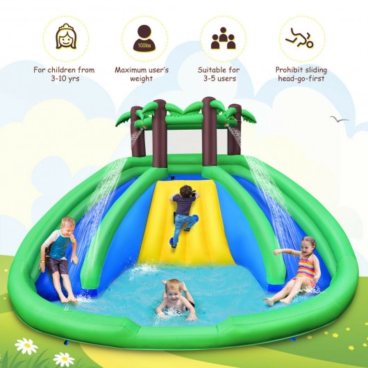 This bouncy castle is perfect for children as a holiday gift birthday gift Christmas gift to keep health and active growth!   This inflatable bounce castle will bring continuous happiness and accompany your kids through their childhood! The bounce house is dedicated to bringing fun and happiness to children in a safe environment. It has lots of fun for children and much helpful to children�s growth and health. You can use it in summer or winter indoor or outdoor. What�s more two curved slides splash pool and climbing wall offer different fun. The unique coconut tree appearance could effectively attract their attention. While providing infinity fun it also focuses on safety. Made of 420D oxford fabric coated with PVC and durable 840D oxford this inflatable bouncer house is puncture-resistant.   A safe and high quality inflatable bounce slide would be a perfect choice.   Multiple playing areas including 2 slides climbing wall and splash pool Freeing the children from the bondage of electronic products and releasing athletic nature High quality 420D Oxford coated with PVC and 840D Oxford puncture-resistant Safe design covered with safety fence to protect the children from falling Dual use summer or winter indoor or outdoor Quickly inflation and deflation easy to store Complete accessories for convenient usage Best toy for children aged from 3 to 10 years old holding up to 5 people Note: Blower is not included