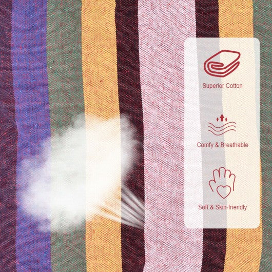 This comfortable and trendy hammock swing is the perfect addition to any indoor or outdoor space. This strap hammock swing chair is versatile. Hammock swing is paired with back support and two seat cushions for extra comfort. It is made of sturdy cotton and polyester fabric which can be machine washed. And it can be hung anywhere and holds up to 260 lbs. This is a great piece for you enjoy your leisure time. It is perfect for outdoor and indoor use. Don't hesitate to buy it! High quality and brand new Perfect for outdoor and indoor use With back support and two seat cushions for extra comfort Light weight and simple to carry Easy to operate Good choice for sleeping entertaining and relaxing