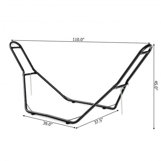Specification: Color: Black Material: Steel Overall dimension: 110" x 37.5" x 45" (L x W x H) Net weight: 32lbs Load capacity: 330lbs Package includes: 1 x Hammock stand 1 x Instruction