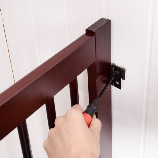 Constructed of wood and durable frame the pet gate ensures a reliable use moving your pets from one place to another. This pet gate is made of wood and with a cherry finish perfect for doorways hallways entryways stairs and more. This expandable pet gate is 30 inches tall and it is lightweight so you can easily carry it from one place to another. The gate is made to rotate 360 degrees and can be positioned between doorways and structures which makes it possible to adjust as you like. This gate can also be used as a small four-sided pen for small pets. Don't hesitate to buy it! Brand new and high quality Beautiful pine wood construction cherry finish Spring-loaded lock for added security Add rubber pads at the bottom of pet gates to prevent sliding and keeps floors safe from scratching Versatile design lets owner customize pets roaming space Many configurable variations including gate or pen Special hinges allow panels to rotate 360 degrees for limitless configurations Folds down to store in seconds lightweight for ease of use Perfect for doorways hallways entryways stairs home and more Designed for small to medium pets Includes one pack of spare screws