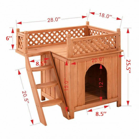Wood Pet Dog House with Roof Balcony & Bed Shelter