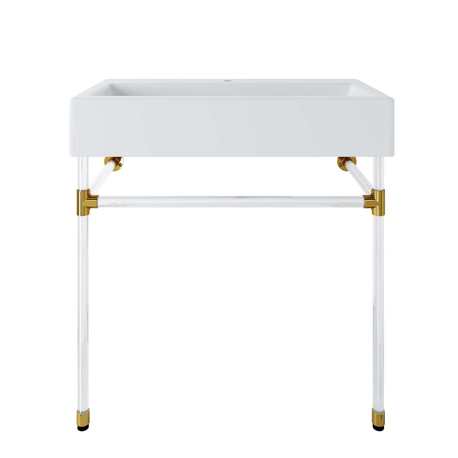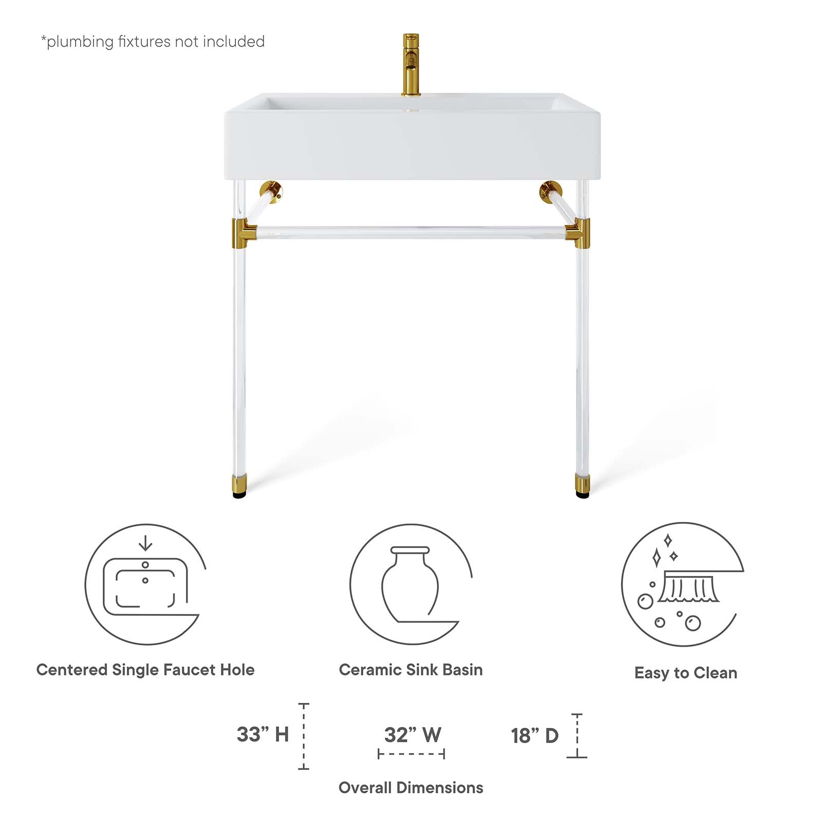 Create a bathroom oasis with the minimalist style and efficiency of the Redeem Wall-Mount Acrylic Bathroom Vanity. The glossy white ceramic basin and streamlined acrylic frame affix directly and securely to the bathroom or powder room wall. Redeem dispenses gentility in spaces large and small, resting confidently on a sturdy acrylic frame with gold joints for added stability. This bathroom vanity has a single faucet hole and is outfitted with non-marking foot caps to protect your bathroom floor. Assembly required and fixtures not included. Set Includes: One - Redeem 32" Acrylic Wall-Mount Bathroom Vanity
